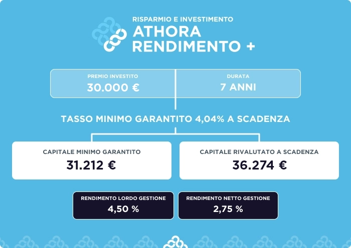 Messaggio pubblicitario. Il presenta Simulatore rappresenta i rendimenti attesi dalla Gestione Separata Athora Risparmio Protetto; i dati sono forniti tenendo in considerazione tutti i prodotti cui la Gestione Separata ad oggi si riferisce e considerando la media di rendimenti e costi dei singoli prodotti. Per scoprire le caratteristiche (garanzie, periodo di detenzione raccomandato, costi e rendimenti) dei singoli prodotti riferiti alla Gestione Separata Athora Risparmio Protetto consulta questa pagina. Prima della sottoscrizione del singolo prodotto, leggere il Set Informativo disponibile sul presente sito.
