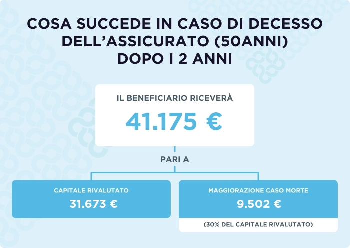 In caso di premorienza e fino all’età di 75 anni il capitale da liquidare viene maggiorato di una percentuale in base all’età dell’Assicurato, con il massimo di 30.000 €.