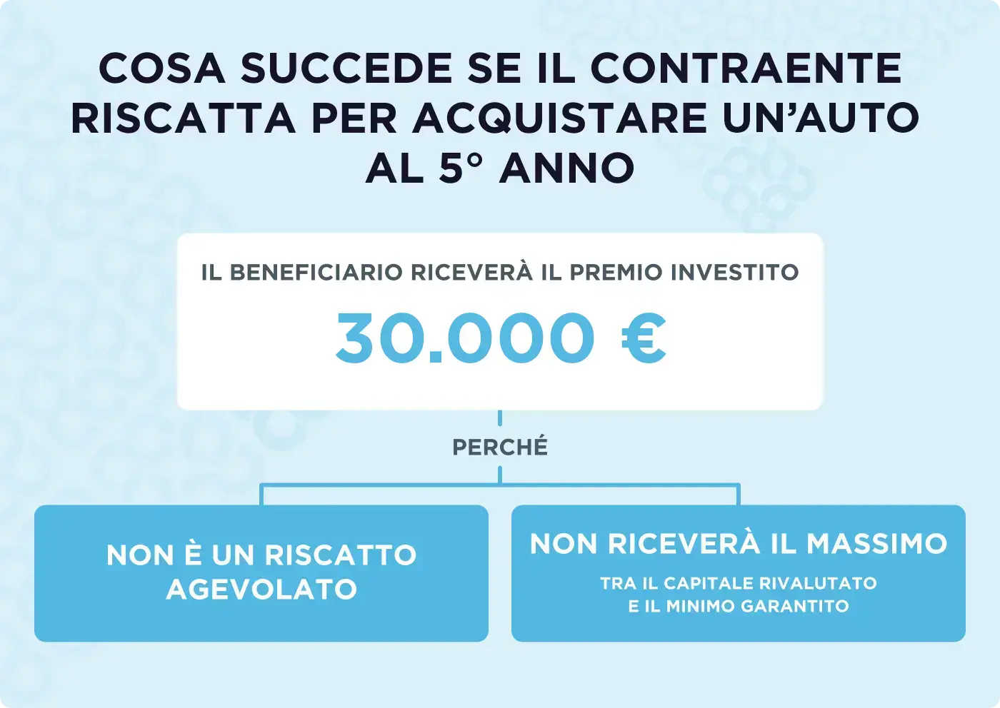 A fronte di particolari circostanze della vita, come l’acquisto della prima casa o malattie gravi, grazie all’opzione “riscatto agevolato” puoi ritirare il denaro investito senza pagare penali. Oltre a questo, ottieni il massimo tra capitale minimo garantito e capitale rivalutato. Gli eventi che danno accesso al riscatto agevolato sono elencati nelle condizioni di polizza.